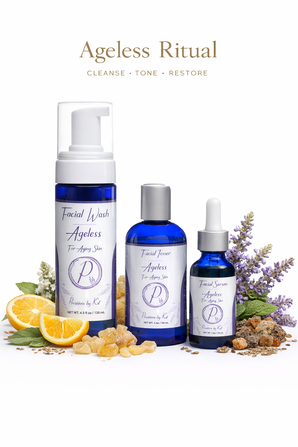 The Ageless Collection was thoughtfully developed to support aging skin at every step, combining gentle cleansing, restorative hydration, and nutrient-rich nourishment to help skin feel balanced, firm, and renewed.